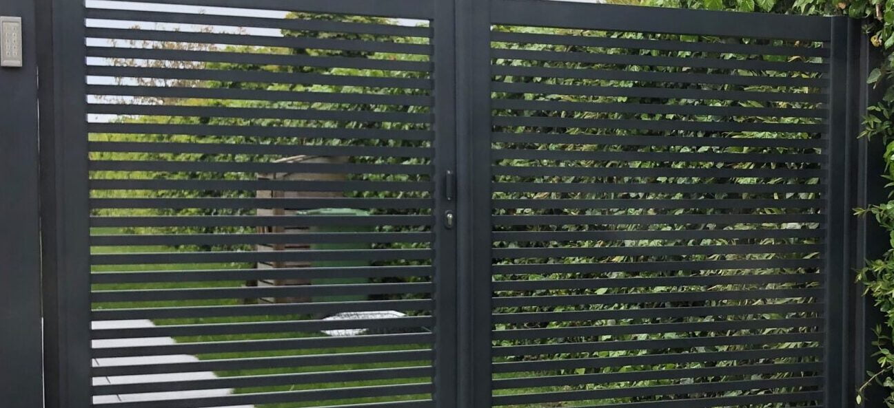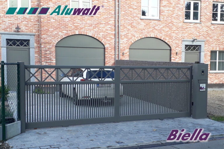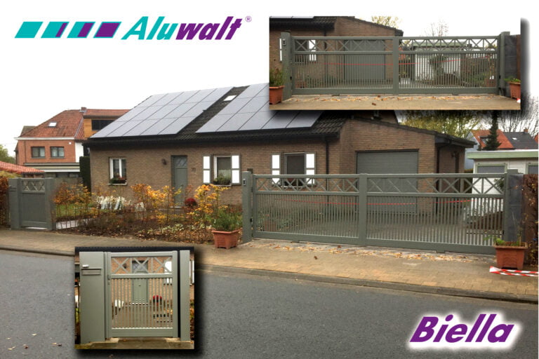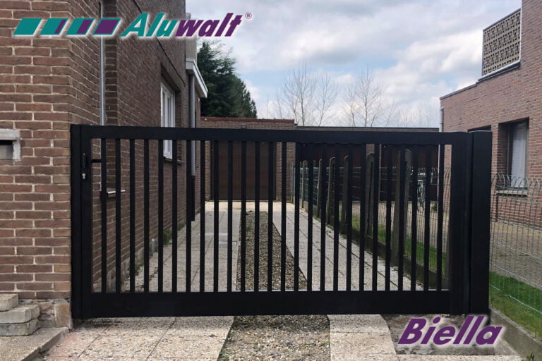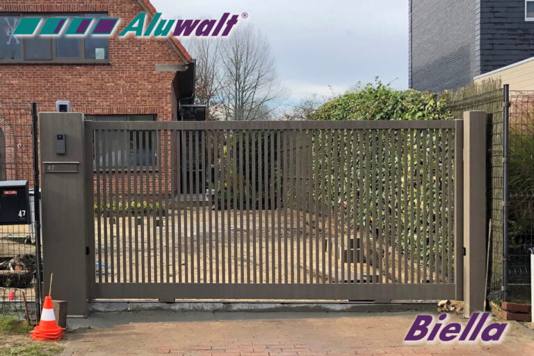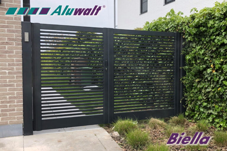 Dit poort/hek is samengesteld uit horizontaal of verticaal geplaatste aluminium lamellen van 3 cm. De tussenruimte is vrij te kiezen.